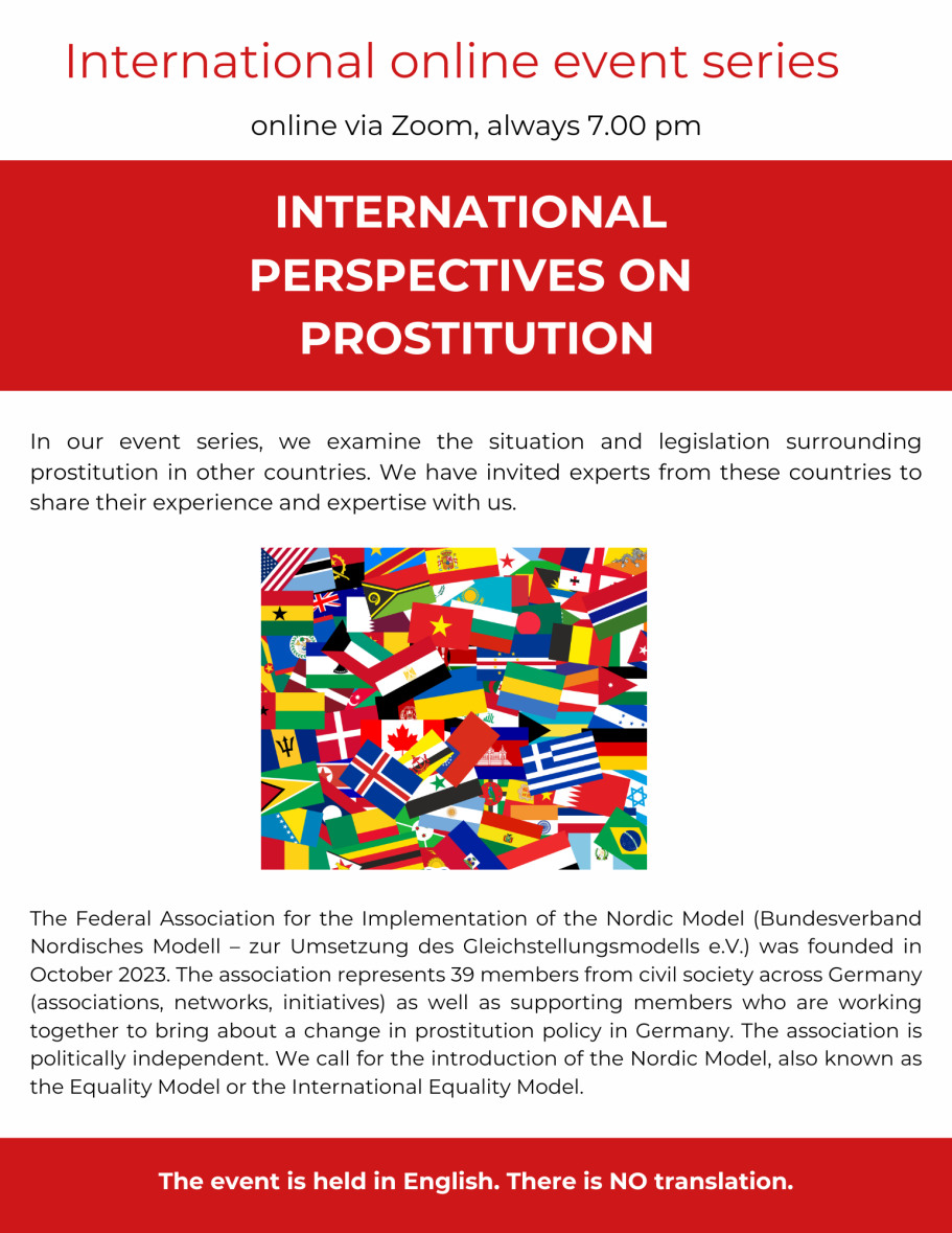 Der Bundesverband Nordisches Modell - zur Umsetzung des Gleichstellungsmodells e.V. hat sich im Oktober 2023 gegründet. Der Bundesverband vertritt knapp 30 bundesweit zivilgesellschaftlich engagierte Mitglieder (Vereine, Netzwerke, Initiativen) sowie Fördermitglieder, die sich gemeinsam für ein Umsteuern in der Prostitutionspolitik in Deutschland einsetzen. Der Bundesverband ist parteipolitisch unabhängig.