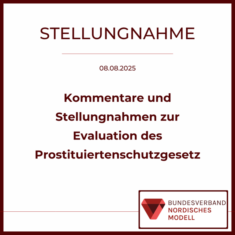 Der Bundesverband Nordisches Modell e.V. begrüßt den Antrag und die vorgeschlagenen Maßnahmen der CDU/CSU-Fraktion vom 20.02.2024. Seit über 20 Jahren verfolgt Deutschland ein Gesetzesmodell, das den Prostitutionsmarkt mit all seinen Akteuren legalisiert und den Sexkauf normalisiert hat. Nach über 20 Jahren sind die erhofften Ziele dieser Gesetzgebung nicht erreicht worden. Die Situation Prostituierter hat sich nicht verbessert. Die meisten prostituierten Frauen sind fremdbestimmt in der Prostitution. Die Frauen sind meist isoliert und müssen häufig den Aufenthaltsort wechseln. Kaum eine Frau...